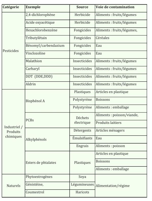 On compte aujourd'hui plus de 100 000 produits chimiques de synthèse sur le marché. Seule une petite partie d'entre eux présente un potentiel de perturbation endocrinienne. L'attention se porte sur un groupe relativement restreint de composés de synthèse, notamment les pesticides organochlorés, les polychlorobiphényles (PCB), le bisphénol A (BPA), les alkylphénols et les phtalates, ainsi que sur un groupe de composés végétaux naturels appelés phytoestrogènes (tableau 2). La plupart de ces composés ont été étudiés pour leur capacité à imiter l'action des œstrogènes (ils se comportent alors comme des xénoestrogènes). Cependant, il est reconnu que de nombreux perturbateurs endocriniens peuvent interférer avec d'autres systèmes endocriniens, notamment les systèmes testiculaire, surrénalien et thyroïdien. Certains produits chimiques agissent sur plusieurs systèmes endocriniens, un phénomène qui peut dépendre de la concentration, du tissu, ou des deux. De nombreux perturbateurs endocriniens présentent également peu de ressemblance structurelle avec l'hormone naturelle avec laquelle ils interfèrent, mais sont capables d'induire des effets agonistes ou antagonistes via un certain nombre de mécanismes différents (tableau 1)